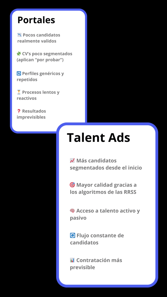 En Talent Ads utilizamos publicidad digital para atraer talento de forma activa, llegando tanto a personas que están buscando empleo como a profesionales que no lo buscan, pero sí están abiertos a escuchar nuevas oportunidades. Hoy el talento está en redes sociales, no en portales de empleo.